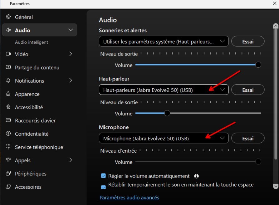 Une fois dans le menu audio vous pouvez vérifier que votre casque (Jabra ou Dell) apparait bien dans “Haut-Parleur” et “Microphone”. N’oubliez pas d’enregistrer !