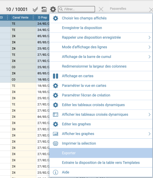 À l’écran s’affiche la liste des champs à exporter, avec par défaut ceux présents dans la vue initiale.