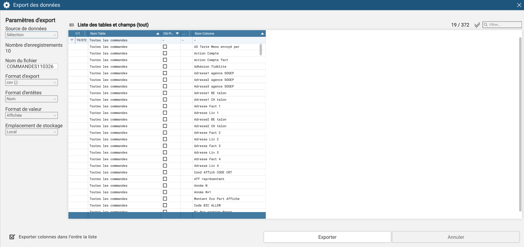 Si la case « Exporter les colonnes dans l’ordre de la liste » n’est pas cochée, les colonnes sont triées selon l’ordre défini dans la base de données.